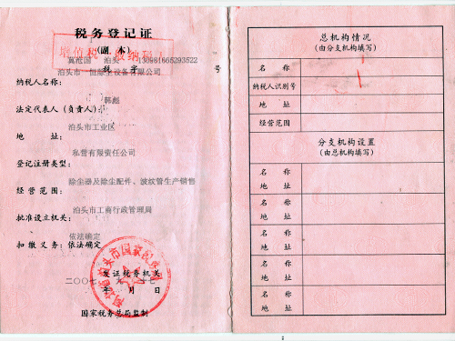 一恒稅務登記證-一恒稅務登記證-泊頭市一恒除塵設備有限公司